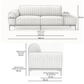 MedidasAltura Total: 78 cmLargura Total (com mesa estofada): 180 cmProfundidade Total: 85 cmPeso: 80 kgAltura do Encosto: 40 cmAltura do Assento ao Chão: 46 cmAltura do Braço: 20 cmAltura dos Pés: 18 cmLargura Livre do Assento: 115 cmProfundidade Livre do Assento: 55 cmLargura do Braço: 25 cmLargura da Mesa Estofada: 40 cmProfundidade da Mesa Estofada: 90 cm