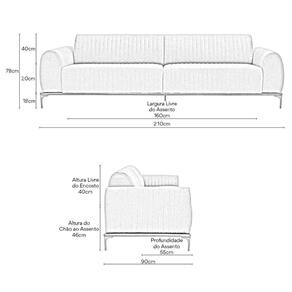 MedidasAltura Total: 78 cmLargura: 210 cmProfundidade: 90 cmPeso: 80 kgAltura do Encosto: 40 cmAltura do Assento ao Chão: 46 cmAltura do Braço: 20 cmAltura dos Pés: 18 cmLargura Livre do Assento: 160 cmProfundidade Livre do Assento: 55 cmLargura do Braço: 25 cm