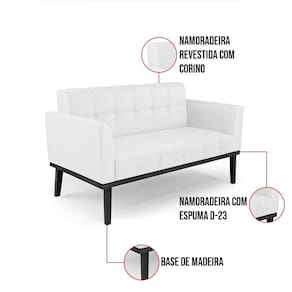 Você gosta de colecionar vários momentos memoráveis com sua família e amigos? Que tal recebê-los, com móveis de altíssima qualidade que só a D'Rossi tem? O Sofá Namoradeira Elisa é adequado para você! Seu design retrô é a grande tendência do momento. Pode ser em diversos espaços da casa, em salas, hall de entrada, quartos, cozinhas, varanda, sacada, escritório, dentre outros. Contém as seguintes características: A estrutura é feita de madeira de Eucalipto 100% de reflorestamento, e a Base de Madeira Preto, além de ser resistente e durável, suporta em média até 120 kg. Assento, encosto e braços, contém enchimento de espuma D-23 e é estofada em tecido Corino, no tom Branco, que oferece muito conforto e resistência ao sentar, com aquela sensação de maciez e aconchego. Possui também, detalhes de costura no encosto e assento, resultando em um acabamento impecável, conferindo muito mais valor e elegância ao seu espaço. Para complementar a decoração com esse lindo Sofá Namoradeira, a dica é utilizar mantas, almofadas ou vasinho de flor. E pronto, seu cantinho estará perfeito para descansar e relaxar! Aqui, você encontra várias opções, para que seus amigos e familiares se sintam acolhidos. Garanta já seu Sofá Namoradeira.