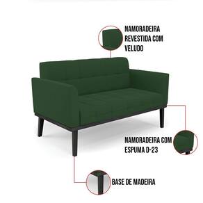 Estrutura: Madeira Eucalipto Espuma: D-23 Tecido: Veludo Tipo de pés: Base de Madeira Fixa Preto Peso suportado: Até 120 Kg Garantia: 90 dias contra defeito de fabricação Montagem: O produto vai montado, apenas parafusar a base Instruções de limpeza: Utilizar um pano limpo e levemente úmido Você irá receber: 01 Sofá Namoradeira - Entregue em: 01 Volume