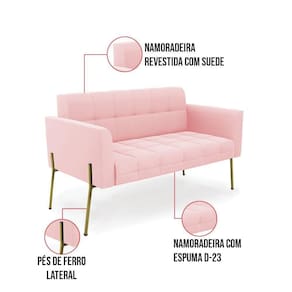Você gosta de colecionar vários momentos memoráveis com sua família e amigos? Que tal recebê-los, com móveis de altíssima qualidade que só a D'Rossi tem? O Sofá Namoradeira Elisa é adequado para você! Seu design retrô é a grande tendência do momento. Pode ser utilizado em diversos espaços da casa, em salas, hall de entrada, quartos, cozinhas, varanda, sacada, escritório, dentre outros. Contém as seguintes características: A estrutura é feita Madeira de Eucalipto 100% de reflorestamento,Pés de Ferro Dourado que além de ser resistente e durável, suporta em média até 120 kg. Assento, encosto e braços, contém enchimento de espuma D-23 e é estofada em tecido Suede, no tom Rosa Bebê, que oferece muito conforto e resistência ao sentar, com aquela sensação de maciez e aconchego. Possui também, detalhes de costura no encosto e assento, resultando em um acabamento impecável, conferindo muito mais valor e elegância ao seu espaço. Para complementar a decoração com esse lindo Sofá Namoradeira, a dica é utilizar mantas, almofadas ou vasinho de flor. E pronto, seu cantinho estará perfeito para descansar e relaxar! Aqui, você encontra várias opções, para que seus amigos e familiares se sintam acolhidos. Garanta já seu Sofá Namoradeira.