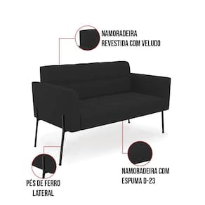 Você gosta de colecionar vários momentos memoráveis com sua família e amigos? Que tal recebê-los, com móveis de altíssima qualidade que só a D'Rossi tem? O Sofá Namoradeira Elisa é adequado para você! Seu design retrô é a grande tendência do momento. Pode ser utilizado em diversos espaços da casa, em salas, hall de entrada, quartos, cozinhas, varanda, sacada, escritório, dentre outros. Contém as seguintes características: A estrutura é feita Madeira de Eucalipto 100% de reflorestamento,Pés de Ferro Preto que além de ser resistente e durável, suporta em média até 120 kg. Assento, encosto e braços, contém enchimento de espuma D-23 e é estofada em tecido Veludo, na cor Preto, que oferece muito conforto e resistência ao sentar, com aquela sensação de maciez e aconchego. Possui também, detalhes de costura no encosto e assento, resultando em um acabamento impecável, conferindo muito mais valor e elegância ao seu espaço. Para complementar a decoração com esse lindo Sofá Namoradeira, a dica é utilizar mantas, almofadas ou vasinho de flor. E pronto, seu cantinho estará perfeito para descansar e relaxar! Aqui, você encontra várias opções, para que seus amigos e familiares se sintam acolhidos. Garanta já seu Sofá Namoradeira.