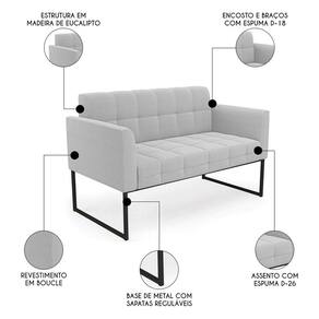 Esta Namoradeira é revestida em bouclé, que é confortável, suave ao toque, e ainda valoriza o design do sofá. Os braços e encosto são confortáveis em espuma D-18, já o assento é com espuma D-26 de alta densidade, que garante um assento firme e aconchegante, ideal para relaxar após um dia cansativo. A base industrial é um charme à parte, que confere um toque Moderno e sofisticado à peça. O Sofá Namoradeira tem uma estrutura resistente e suporta até 120 kg. A montagem é muito simples, pois ela já vem pronta, bastando apenas fixar a base com os parafusos que acompanham o produto. A limpeza também é muito prática, pois basta utilizar um pano limpo e levemente úmido, sem produtos abrasivos, para manter a sua Namoradeira sempre em bom estado. Sem dúvidas essa Namoradeira 2 Lugares, vai transformar a sua sala em um ambiente mais confortável e estiloso!