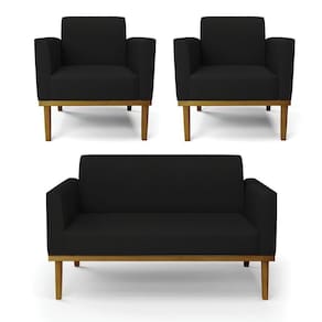 Sofá Namoradeira Com 2 Poltronas Base De Madeira Fixa Castanho Marisa Linho Preto A79 D03 - D?rossi