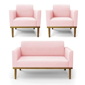 Sofá Namoradeira Com 2 Poltronas Base De Madeira Fixa Castanho Marisa Suede Rosa Bebê D03 - D?rossi