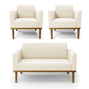 Sofá Namoradeira Com 2 Poltronas Base De Madeira Fixa Castanho Marisa Veludo Bege D03 - D?rossi