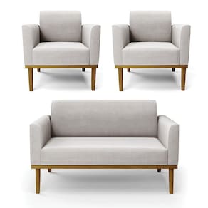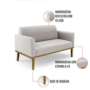 Sofá Namoradeira Com 2 Poltronas Base De Madeira Fixa Castanho Marisa Veludo Cinza D03 - D?rossi