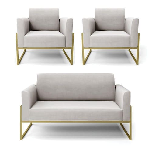Sofá Namoradeira Com 2 Poltronas Base Industrial Alta Dourado Marisa Veludo D03 - D\\'rossi Cor Cinza