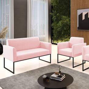 Sofá Namoradeira Com Poltrona Base Industrial Preto Marisa Suede Rosa Bebê