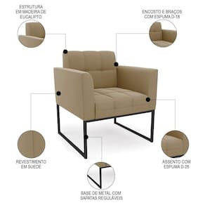 O Sofá Namoradeira e a Poltrona Decorativa são revestidos em Suede, que é fácil de limpar e valoriza o design das peças. Eles têm braços e encosto em espuma D-18 e assento em espuma D-26, que oferecem firmeza e aconchego para você relaxar. A base industrial é um detalhe charmoso, que dá um toque moderno e sofisticado ao conjunto. O kit tem uma estrutura resistente e suporta até 120 kg cada peça. A montagem é simples, pois as peças já vêm prontas, bastando fixar a base com os parafusos que acompanham o produto. A limpeza é prática, pois basta usar um pano limpo e levemente úmido, sem produtos abrasivos, para manter o seu kit sempre em bom estado. Hora de transformar seu ambiente com a Namoradeira 2 Lugares e a Poltrona para Sala deixando ainda mais confortável e estiloso.