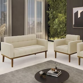 O Sofá Namoradeira e 1 Poltrona Base Madeira Castanho Ana Suede Bege, da Ibiza é o conjunto ideal para quem busca beleza, conforto e versatilidade. Você pode usar na sua Sala De Estar, recepção ou qualquer outro ambiente que desejar.