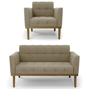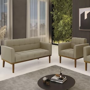 O Sofá Namoradeira e a Poltrona Decorativa são revestidos em Suede, que é fácil de limpar e valoriza o design das peças. Eles têm braços e encosto em espuma D-18 e assento em espuma D-26, que oferecem firmeza e aconchego para você relaxar. A base em madeira de eucalipto castanho é um detalhe charmoso, que dá um toque rústico e sofisticado ao conjunto. O kit tem uma estrutura resistente e suporta até 120 kg cada peça. A montagem é simples, pois as peças já vêm prontas, bastando fixar a base com os parafusos que acompanham o produto. A limpeza é prática, pois basta usar um pano limpo e levemente úmido, sem produtos abrasivos, para manter o seu kit sempre em bom estado. Hora de transformar seu ambiente com a Namoradeira 2 Lugares e a Poltrona para Sala deixando ainda mais confortável e estiloso.