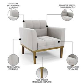 O Sofá Namoradeira e a Poltrona Decorativa são revestidos em Veludo, que é fácil de limpar e valoriza o design das peças. Eles têm braços e encosto em espuma D-18 e assento em espuma D-26, que oferecem firmeza e aconchego para você relaxar. A base em madeira de eucalipto castanho é um detalhe charmoso, que dá um toque rústico e sofisticado ao conjunto. O kit tem uma estrutura resistente e suporta até 120 kg cada peça. A montagem é simples, pois as peças já vêm prontas, bastando fixar a base com os parafusos que acompanham o produto. A limpeza é prática, pois basta usar um pano limpo e levemente úmido, sem produtos abrasivos, para manter o seu kit sempre em bom estado. Hora de transformar seu ambiente com a Namoradeira 2 Lugares e a Poltrona para Sala deixando ainda mais confortável e estiloso.