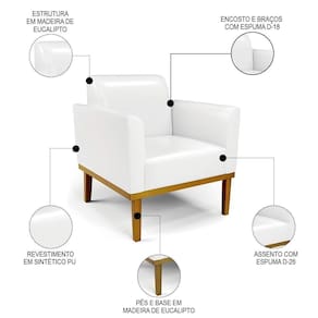 O Sofá Namoradeira e a Poltrona Decorativa são revestidos em sintético PU branco, que é fácil de limpar e valoriza o design das peças. Eles têm braços e encosto em espuma D-18 e assento em espuma D-26, que oferecem firmeza e aconchego para você relaxar. A base em madeira de eucalipto castanho é um detalhe charmoso, que dá um toque rústico e sofisticado ao conjunto. O kit tem uma estrutura resistente e suporta até 120 kg cada peça. A montagem é simples, pois as peças já vêm prontas, bastando fixar a base com os parafusos que acompanham o produto. A limpeza é prática, pois basta usar um pano limpo e levemente úmido, sem produtos abrasivos, para manter o seu kit sempre em bom estado. Hora de transformar seu ambiente com a Namoradeira 2 Lugares e a Poltrona para Sala deixando ainda mais confortável e estiloso.