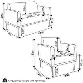 O Sofá Namoradeira e a Poltrona Decorativa são revestidos em Suede, que é fácil de limpar e valoriza o design das peças. Eles têm braços e encosto em espuma D-18 e assento em espuma D-26, que oferecem firmeza e aconchego para você relaxar. A base em madeira de eucalipto castanho é um detalhe charmoso, que dá um toque rústico e sofisticado ao conjunto. O kit tem uma estrutura resistente e suporta até 120 kg cada peça. A montagem é simples, pois as peças já vêm prontas, bastando fixar a base com os parafusos que acompanham o produto. A limpeza é prática, pois basta usar um pano limpo e levemente úmido, sem produtos abrasivos, para manter o seu kit sempre em bom estado. Hora de transformar seu ambiente com a Namoradeira 2 Lugares e a Poltrona para Sala deixando ainda mais confortável e estiloso.