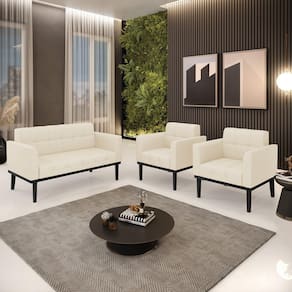Sofá Namoradeira e 2 Poltronas Base de Madeira Preto Elisa Linho Bege A19 D03 - D`Rossi