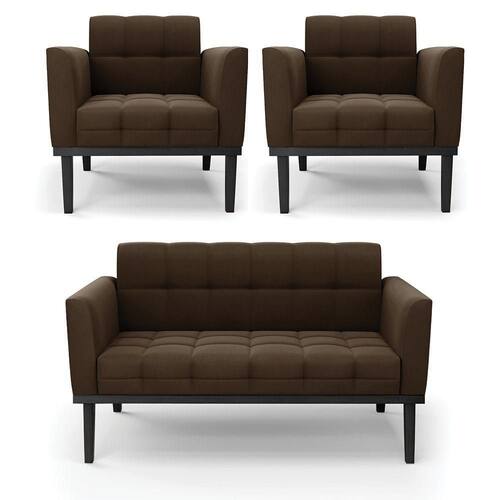Você gosta de colecionar vários momentos memoráveis com sua família e amigos? Que tal recebê-los, com móveis de altíssima qualidade que só a D'Rossi tem? O Sofá Sofá Namoradeira e Poltrona Elisa é adequado para você! Seu design retrô é a grande tendência do momento. Pode ser utilizado em diversos espaços da casa, em salas, hall de entrada, quartos, cozinhas, varanda, sacada, escritório, dentre outros. Contém as seguintes características: A estrutura é feita de madeira de Eucalipto 100% de reflorestamento, e a Base de Madeira Fixa Preto, além de ser resistente e durável, suporta em média até 120 kg. Assento, encosto e braços, contém enchimento de espuma D-23 e é estofada em tecido Suede, no tom Marrom, que oferece muito conforto e resistência ao sentar, com aquela sensação de maciez e aconchego. Possui também, detalhes de costura no encosto e assento, resultando em um acabamento impecável, conferindo muito mais valor e elegância ao seu espaço. Para complementar a decoração com esse lindo Kit Sofá Namoradeira e Poltrona Elisa, a dica é utilizar mantas, almofadas ou vasinho de flor. E pronto, seu cantinho estará perfeito para descansar e relaxar! Aqui, você encontra várias opções, para que seus amigos e familiares se sintam acolhidos. Garanta já seu Kit Sofá Namoradeira e 2 Poltronas Elisa.