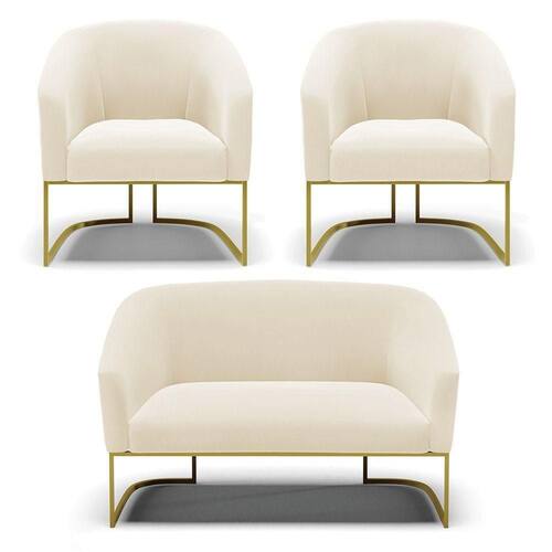 O Sofá Namoradeira 2 lugares e 2 Poltronas Stella é uma peça que combina elegância, conforto e durabilidade. Este conjunto tem um design moderno e sofisticado, com Base Industrial Dourado e revestimento em tecido Veludo Bege, que harmonizam com qualquer ambiente. Ele é ideal para sala de estar, recepções, mesa de jantar ou qualquer outro espaço que você queira decorar com estilo e bom gosto. Ele tem uma estrutura em madeira de reflorestamento eucalipto, que garante a resistência e a sustentabilidade do produto. Ele suporta até 120 kg de peso, podendo ser utilizado por pessoas de diferentes biotipos. Ele tem um acabamento reforçado e espuma de qualidade D23, que oferece maciez e aconchego. Tem pés em aço carbono e pintura eletrostática, que protegem o produto contra corrosão e desgaste. Ele tem assento com persintas elásticas, que proporcionam flexibilidade e conforto. O kit Stella é um produto de alta qualidade, beleza e funcionalidade. Ele é fácil de transportar, pois tem um peso leve e um tamanho compacto. O Sofá Namoradeira 2 lugares e 2 Poltronas Stella é um produto que vai fazer a diferença na sua decoração e no seu bem-estar. Ele vai trazer charme, conforto e durabilidade para o seu ambiente. Aproveite essa oferta e leve para casa um Sofá Namoradeira 2 lugares e 2 Poltronas qualidade por um preço incrível. Essa é a sua chance de ter um kit maravilhoso por um preço imperdível. Corra e garanta seu Sofá Namoradeira 2 lugares e 2 Poltronas antes que acabe o estoque!
