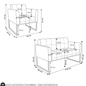 O Sofá Namoradeira e a Poltrona Decorativa são revestidos em Suede, que é fácil de limpar e valoriza o design das peças. Eles têm braços e encosto em espuma D-18 e assento em espuma D-26, que oferecem firmeza e aconchego para você relaxar. A base industrial é um detalhe charmoso, que dá um toque moderno e sofisticado ao conjunto. O kit tem uma estrutura resistente e suporta até 120 kg cada peça. A montagem é simples, pois as peças já vêm prontas, bastando fixar a base com os parafusos que acompanham o produto. A limpeza é prática, pois basta usar um pano limpo e levemente úmido, sem produtos abrasivos, para manter o seu kit sempre em bom estado. Hora de transformar seu ambiente com a Namoradeira 2 Lugares e a Poltrona para Sala deixando ainda mais confortável e estiloso.