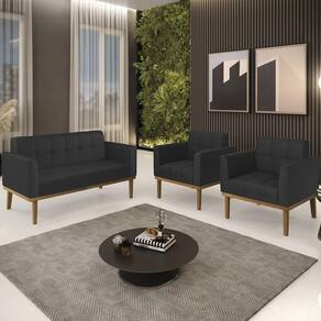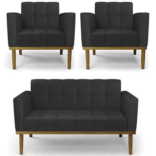 O Sofá Namoradeira e 2 Poltronas Base Madeira Castanho Ana Sintético Preto, da Ibiza é o conjunto ideal para quem busca beleza, conforto e versatilidade. Você pode usar na sua Sala De Estar, recepção ou qualquer outro ambiente que desejar.