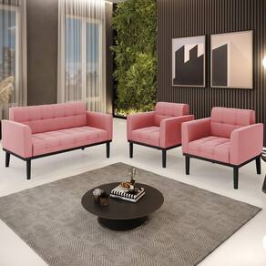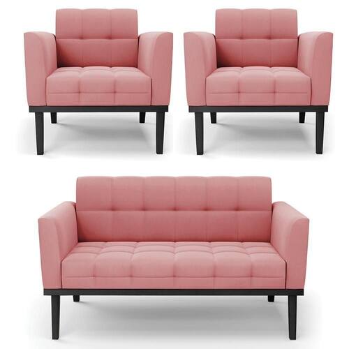 O Sofá Namoradeira e 2 Poltronas Base Madeira Preto Ana Suede Rosê, da Ibiza é o conjunto ideal para quem busca beleza, conforto e versatilidade. Você pode usar na sua Sala De Estar, recepção ou qualquer outro ambiente que desejar.