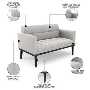 O Sofá Namoradeira e a Poltrona Decorativa são revestidos em Veludo, que é fácil de limpar e valoriza o design das peças. Eles têm braços e encosto em espuma D-18 e assento em espuma D-26, que oferecem firmeza e aconchego para você relaxar. A base em madeira de eucalipto Preto é um detalhe charmoso, que dá um toque rústico e sofisticado ao conjunto. O kit tem uma estrutura resistente e suporta até 120 kg cada peça. A montagem é simples, pois as peças já vêm prontas, bastando fixar a base com os parafusos que acompanham o produto. A limpeza é prática, pois basta usar um pano limpo e levemente úmido, sem produtos abrasivos, para manter o seu kit sempre em bom estado. Hora de transformar seu ambiente com a Namoradeira 2 Lugares e a Poltrona para Sala deixando ainda mais confortável e estiloso.