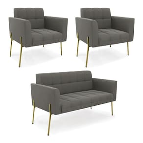 Você gosta de colecionar vários momentos memoráveis com sua família e amigos? Que tal recebê-los, com móveis de altíssima qualidade que só a D'Rossi tem? O Sofá Sofá Namoradeira e Poltrona Elisa é adequado para você! Seu design retrô é a grande tendência do momento. Pode ser utilizado em diversos espaços da casa, em salas, hall de entrada, quartos, cozinhas, varanda, sacada, escritório, dentre outros. Contém as seguintes características: A estrutura é feita Madeira de Eucalipto 100% de reflorestamento,Pés de Ferro Dourado que além de ser resistente e durável, suporta em média até 120 kg. Assento, encosto e braços, contém enchimento de espuma D-23 e é estofada em tecido Suede, no tom Grafite, que oferece muito conforto e resistência ao sentar, com aquela sensação de maciez e aconchego. Possui também, detalhes de costura no encosto e assento, resultando em um acabamento impecável, conferindo muito mais valor e elegância ao seu espaço. Para complementar a decoração com esse lindo Kit Sofá Namoradeira e Poltrona Elisa, a dica é utilizar mantas, almofadas ou vasinho de flor. E pronto, seu cantinho estará perfeito para descansar e relaxar! Aqui, você encontra várias opções, para que seus amigos e familiares se sintam acolhidos. Garanta já seu Kit Sofá Namoradeira e 2 Poltronas Elisa.