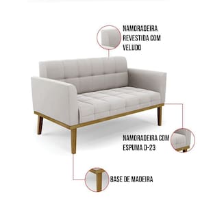 Sofá Namoradeira E Poltrona Base De Madeira Castanho Elisa Veludo D03 - D`rossi Cor Cinza - Blush