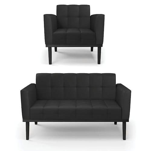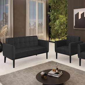 Estrutura: Madeira Eucalipto Espuma: D-23 Tecido: Corino Tipo de pés: Base Madeira Fixa Preto Peso suportado: Até 120 Kg Garantia: 90 dias contra defeito de fabricação Montagem: O produto vai montado, apenas parafusar a base Instruções de limpeza: Utilizar um pano limpo e levemente úmido Você irá receber: 01 Sofá Namoradeira e 02 Poltronas - Entregue em: 03 Volumes