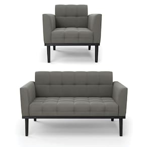 Você gosta de colecionar vários momentos memoráveis com sua família e amigos? Que tal recebê-los, com móveis de altíssima qualidade que só a D'Rossi tem? O Sofá Sofá Namoradeira e Poltrona Elisa é adequado para você! Seu design retrô é a grande tendência do momento. Pode ser utilizado em diversos espaços da casa, em salas, hall de entrada, quartos, cozinhas, varanda, sacada, escritório, dentre outros. Contém as seguintes características: A estrutura é feita de madeira de Eucalipto 100% de reflorestamento, e a Base de Madeira Fixa Preto, além de ser resistente e durável, suporta em média até 120 kg. Assento, encosto e braços, contém enchimento de espuma D-23 e é estofada em tecido Suede, no tom Grafite, que oferece muito conforto e resistência ao sentar, com aquela sensação de maciez e aconchego. Possui também, detalhes de costura no encosto e assento, resultando em um acabamento impecável, conferindo muito mais valor e elegância ao seu espaço. Para complementar a decoração com esse lindo Kit Sofá Namoradeira e Poltrona Elisa, a dica é utilizar mantas, almofadas ou vasinho de flor. E pronto, seu cantinho estará perfeito para descansar e relaxar! Aqui, você encontra várias opções, para que seus amigos e familiares se sintam acolhidos. Garanta já seu Kit Sofá Namoradeira e Poltrona Elisa.