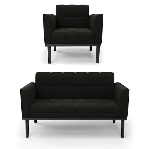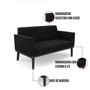 Você gosta de colecionar vários momentos memoráveis com sua família e amigos? Que tal recebê-los, com móveis de altíssima qualidade que só a D'Rossi tem? O Sofá Sofá Namoradeira e Poltrona Elisa é adequado para você! Seu design retrô é a grande tendência do momento. Pode ser utilizado em diversos espaços da casa, em salas, hall de entrada, quartos, cozinhas, varanda, sacada, escritório, dentre outros. Contém as seguintes características: A estrutura é feita de madeira de Eucalipto 100% de reflorestamento, e a Base de Madeira Fixa Preto, além de ser resistente e durável, suporta em média até 120 kg. Assento, encosto e braços, contém enchimento de espuma D-23 e é estofada em tecido Suede, no tom Preto, que oferece muito conforto e resistência ao sentar, com aquela sensação de maciez e aconchego. Possui também, detalhes de costura no encosto e assento, resultando em um acabamento impecável, conferindo muito mais valor e elegância ao seu espaço. Para complementar a decoração com esse lindo Kit Sofá Namoradeira e Poltrona Elisa, a dica é utilizar mantas, almofadas ou vasinho de flor. E pronto, seu cantinho estará perfeito para descansar e relaxar! Aqui, você encontra várias opções, para que seus amigos e familiares se sintam acolhidos. Garanta já seu Kit Sofá Namoradeira e Poltrona Elisa.