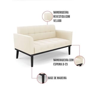 Você gosta de colecionar vários momentos memoráveis com sua família e amigos? Que tal recebê-los, com móveis de altíssima qualidade que só a D'Rossi tem? O Sofá Sofá Namoradeira e Poltrona Elisa é adequado para você! Seu design retrô é a grande tendência do momento. Pode ser utilizado em diversos espaços da casa, em salas, hall de entrada, quartos, cozinhas, varanda, sacada, escritório, dentre outros. Contém as seguintes características: A estrutura é feita de madeira de Eucalipto 100% de reflorestamento, e a Base de Madeira Fixa Preto, além de ser resistente e durável, suporta em média até 120 kg. Assento, encosto e braços, contém enchimento de espuma D-23 e é estofada em tecido Veludo, na cor Bege, que oferece muito conforto e resistência ao sentar, com aquela sensação de maciez e aconchego. Possui também, detalhes de costura no encosto e assento, resultando em um acabamento impecável, conferindo muito mais valor e elegância ao seu espaço. Para complementar a decoração com esse lindo Kit Sofá Namoradeira e Poltrona Elisa, a dica é utilizar mantas, almofadas ou vasinho de flor. E pronto, seu cantinho estará perfeito para descansar e relaxar! Aqui, você encontra várias opções, para que seus amigos e familiares se sintam acolhidos. Garanta já seu Kit Sofá Namoradeira e Poltrona Elisa.