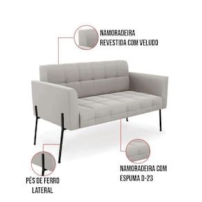 Você gosta de colecionar vários momentos memoráveis com sua família e amigos? Que tal recebê-los, com móveis de altíssima qualidade que só a D'Rossi tem? O Sofá Sofá Namoradeira e Poltrona Elisa é adequado para você! Seu design retrô é a grande tendência do momento. Pode ser utilizado em diversos espaços da casa, em salas, hall de entrada, quartos, cozinhas, varanda, sacada, escritório, dentre outros. Contém as seguintes características: A estrutura é feita Madeira de Eucalipto 100% de reflorestamento, Pés de Ferro Preto que além de ser resistente e durável, suporta em média até 120 kg. Assento, encosto e braços, contém enchimento de espuma D-23 e é estofada em tecido Veludo, que oferece muito conforto e resistência ao sentar, com aquela sensação de maciez e aconchego. Possui também, detalhes de costura no encosto e assento, resultando em um acabamento impecável, conferindo muito mais valor e elegância ao seu espaço. Para complementar a decoração com esse lindo Kit Sofá Namoradeira e Poltrona Elisa, a dica é utilizar mantas, almofadas ou vasinho de flor. E pronto, seu cantinho estará perfeito para descansar e relaxar! Aqui, você encontra várias opções, para que seus amigos e familiares se sintam acolhidos. Garanta já seu Kit Sofá Namoradeira e Poltrona Elisa.