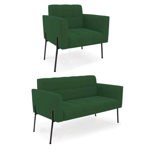 Você gosta de colecionar vários momentos memoráveis com sua família e amigos? Que tal recebê-los, com móveis de altíssima qualidade que só a D'Rossi tem? O Sofá Sofá Namoradeira e Poltrona Elisa é adequado para você! Seu design retrô é a grande tendência do momento. Pode ser utilizado em diversos espaços da casa, em salas, hall de entrada, quartos, cozinhas, varanda, sacada, escritório, dentre outros. Contém as seguintes características: A estrutura é feita Madeira de Eucalipto 100% de reflorestamento, Pés de Ferro Preto que além de ser resistente e durável, suporta em média até 120 kg. Assento, encosto e braços, contém enchimento de espuma D-23 e é estofada em tecido Veludo, na cor Verde, que oferece muito conforto e resistência ao sentar, com aquela sensação de maciez e aconchego. Possui também, detalhes de costura no encosto e assento, resultando em um acabamento impecável, conferindo muito mais valor e elegância ao seu espaço. Para complementar a decoração com esse lindo Kit Sofá Namoradeira e Poltrona Elisa, a dica é utilizar mantas, almofadas ou vasinho de flor. E pronto, seu cantinho estará perfeito para descansar e relaxar! Aqui, você encontra várias opções, para que seus amigos e familiares se sintam acolhidos. Garanta já seu Kit Sofá Namoradeira e Poltrona Elisa.