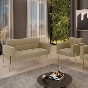 Estrutura: Madeira Eucalipto Espuma: D-23 Tecido: Corino Tipo de pés: Pé de Ferro Dourado Peso suportado: Até 120 Kg Garantia: 90 dias contra defeito de fabricação Montagem: O produto vai montado, apenas parafusar a base Instruções de limpeza: Utilizar um pano limpo e levemente úmido Você irá receber: 01 Sofá Namoradeira e 01 Poltrona - Entregue em: 02 Volumes