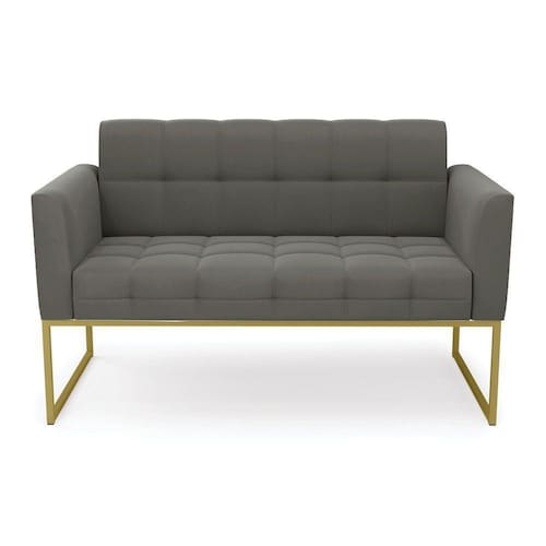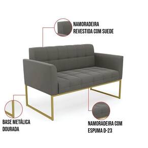 Você gosta de colecionar vários momentos memoráveis com sua família e amigos? Que tal recebê-los, com móveis de altíssima qualidade que só a DRossi tem? A Namoradeira 2 Lugares Elisa é adequada para você! Seu design retrô é a grande tendência do momento. Pode ser usada em diversos espaços da casa, em salas, hall de entrada, quartos, cozinhas, varanda, sacada, escritório, dentre outros. Contém as seguintes características: A estrutura é feita de madeira de Eucalipto 100% de reflorestamento, e a Base Industrial Metálica Dourada, além de ser resistente e durável, suporta em média até 120 kg. Assento, encosto e braços, contém enchimento de espuma D-23 e é estofada em tecido Suede, no tom Grafite, que oferece muito conforto e resistência ao sentar, com aquela sensação de maciez e aconchego. Possui também, detalhes de costura no encosto e assento, resultando em um acabamento impecável, conferindo muito mais valor e elegância ao seu espaço. Para complementar a decoração com essa linda namoradeira, a dica é utilizar mantas, almofadas ou vasinho de flor. E pronto, seu cantinho estará perfeito para descansar e relaxar! Aqui, você encontra várias opções, para que seus amigos e familiares se sintam acolhidos. Garanta já sua Namoradeira Elisa.