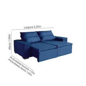 Medidas do Produto:Altura: 1,05mtCumprimento fechado: 1,25cmCumprimento aberto: 1,60cmLargura: 2,20cmInformações Extras:Peso suportado: 120kg por pessoaGarantia: 3 mesesFabricante: De casa décor e estofadosInformações Importantes:- OS TECIDOS PODEM SOFRER ALTERAÇÕES DE TONALIDADES DEPENDENDO DO LOTE DE PRODUÇÃO E TAMBÉM DA RESOLUÇÃO DA TELA DO SEU MONITOR/CELULAR.- Os objetos que ambientam as fotos não acompanham o produto.