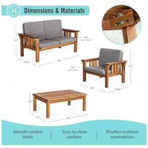 A estrutura é fabricada em madeira maciça de acácia, material reconhecido pela resistência natural às variações de clima, incidência de sol e umidade, o que favorece o uso em áreas externas ao longo do ano, desde que respeitados os cuidados de manutenção indicados pelo fabricante. O tampo da mesa oferece superfície retangular baixa para apoiar livros, lanches, jogos ou atividades de artes, funcionando como ponto central de apoio para o conjunto.