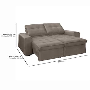 Com 212cm de largura e com assento retrátil proporciona mais conforto nos momentos de descanso, enquanto o encosto reclinável oferece apoio para as costas. O encosto é fixo, com preenchimento em espuma D13 e fibras/flocos (50%) , garantindo suporte suave e duradouro.