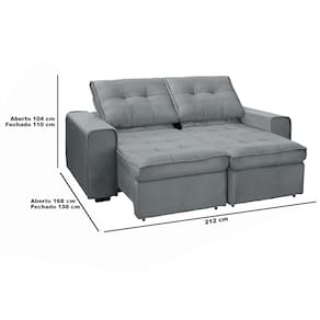 Com 212cm de largura e com assento retrátil proporciona mais conforto nos momentos de descanso, enquanto o encosto reclinável oferece apoio para as costas. O encosto é fixo, com preenchimento em espuma D13 e fibras/flocos (50%) , garantindo suporte suave e duradouro.