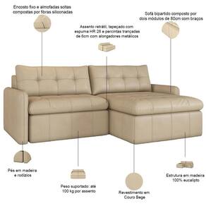 Sofá Retrátil 2 Lugares Para Sala De Estar 184cm Zuno P08 Couro Bege - Lyam Decor