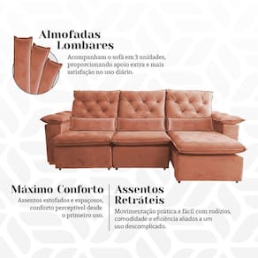 ATENÇÃO: IMAGENS MERAMENTE ILUSTRATIVAS. AS CORES PODEM VARIAR DE ACORDO COM A TELA, MONITOR, ILUMINAÇÃO DO AMBIENTE OU PERCEPÇÃO VISUAL.Sofà RetrÃtil 2.10m Modelo com Encosto ReclinÃvel e Estofado Macio em Suede Aveludado Europa Laranja