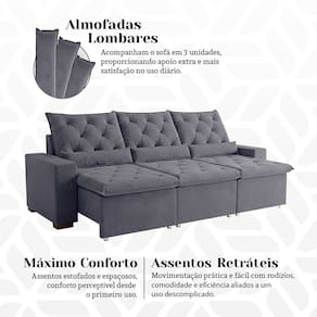Sofá Retrátil 290m 3 Lugares em Suede com Conforto Elevado e Estrutura Reforçada Milão Cinza