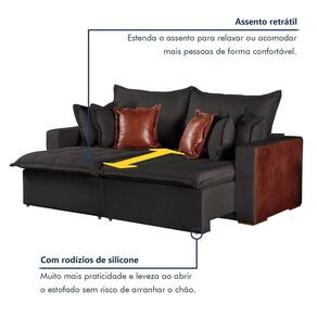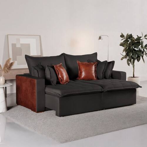 É um sofá cama confortável quando abre? Muito. É confortável e espaçoso. Produto Montado: Não Acompanha Almofadas extras: 06 Almofada do assento: Fixa Almofada do encosto: Removível Altura do assento até o chão: 50.0000 Altura do Encosto: 70 cm Altura dos Pés: 2,5 cm Altura Máxima dos Pés: 2.5000 Ambiente Principal: Sala de Estar codigo_ean: 7900288246899 Cor: Preto Cor do Produto: Preto Densidade do Assento: D-26 Enchimento do Assento: Espuma Estilo de Braço: Braços Quadrados Firmeza do Assento: Macio Itens Inclusos: 1 Sofá e 6 Almofadas Largura do Braço: 20 cm Linha ou Coleção: Siena Marca: Kasacomigo Estofados Material dos Pés: Eucalipto Necessita Montagem: Não Origem do Produto: Nacional Peso: 78 kg Pet Friendly: Não Possui Baú: Não Possui Mola: Sim Possui Percintas Elásticas: Sim Possui Pés: 08 Possui Rodízio: Sim Profundidade Quando Estendido: cm Quantidade de Molas por Assento: 2 Recomendações de Uso, Manutenção e Limpeza: Pano úmido Rodízio com Trava: Não Suporta Até (kg): 300 kg Tecido Predominante: Linho Tipo de Encosto: Regulável Tipo de Mola: Molas Espirais Tipo de Sofá: Sofá Cama Marca: Não Informado