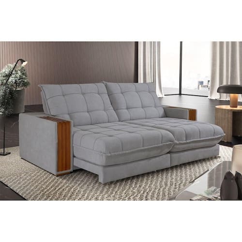 Sofá Retrátil Berlim 2,50m 4 Lugares Molas Ensacadas Txr Prata Sofa Retratil Berlim 2,50M 4 Lugares Molas Ensacadas TXR: Suavidade e conforto em sua casa com o Sofa BERLIM que possui encosto reclinavel, assento com Pillow de molas ensacadas , fibra siliconada, assento retratil com rodizios que facilitam seu movimento. Caracteristicas: Tipo: Sofa 4 lugares Retratil e Reclinavel Marca: TXR Modelo: Berlim Estrutura: Madeira de origem certificada, Eucalipto Revestimento: Em tecido Pes: Em madeira reflorestada Assento: Retratil de Pillow de molas ensacadas com espuma D28 Encosto: Reclinavel em 5 estagios, 100 fibra de silicone Bracos: 25 cm c/Aplique de Madeira Retratil e Reclinavel: Com mecanismo em aco