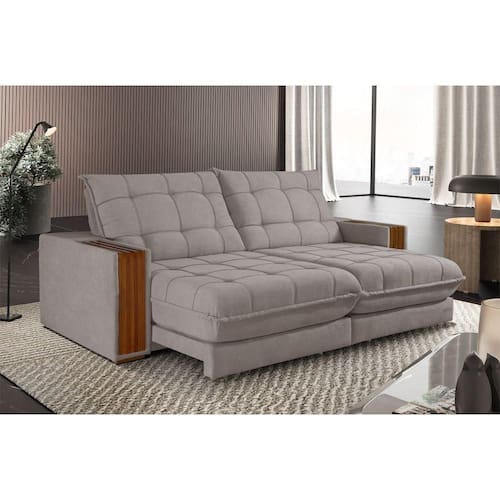 Sofá Retrátil Berlim 2,90m 5 Lugares Molas Ensacadas Txr Bege Sofa Retratil Berlim 2,90M 5 Lugares Molas Ensacadas TXR: Suavidade e conforto em sua casa com o Sofa BERLIM que possui encosto reclinavel, assento com Pillow de molas ensacadas, fibra siliconada, assento retratil com rodizios que facilitam seu movimento. Caracteristicas: Tipo: Sofa 5 lugares Retratil e Reclinavel Marca: TXR Modelo: Berlim Estrutura: Madeira de origem certificada, Eucalipto Revestimento: Em tecido Pes: Em madeira reflorestada Assento: Retratil Pillow de molas ensacadas com espuma D28 Encosto: Reclinavel em 5 estagios, 100 fibra de silicone Bracos: 25 cm c/Aplique de Madeira Retratil e Reclinavel: Com mecanismo em aco