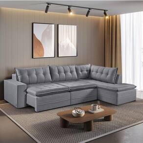 Sofá Retratil Com Chaise Direita Titan 6 Lugares 2,96M Tecido Linho