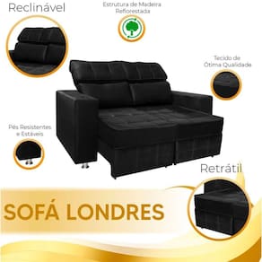 O sofa Londres e retratil e reclinavel, ideal para quem busca conforto. Possui estrutura de madeira e assento e encosto revestidos em tecido macio, que proporciona uma agradavel sensacao ao toque. E reclinavel, o que permite ajustar a posicao de acordo com as necessidades, e retratil, o que facilita o manuseio.