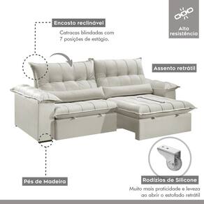 O Sofá Retrátil e Reclinável 200cm Dubai da Tr Móveis é uma combinação perfeita de conforto e estilo. Com um mecanismo retrátil, oferece espaço extra para relaxar, enquanto o sistema reclinável proporciona conforto personalizado. Seu design moderno se adapta a qualquer ambiente, e os materiais de alta qualidade garantem durabilidade. Ideal para salas de estar ou home theaters, este sofá é prático e fácil de montar, tornando-se a escolha perfeita para quem busca funcionalidades e elegantes. Produto Montado: Sim Acompanha Almofadas extras: 02 Almofada do assento: Fixa Almofada do encosto: Fixa Altura do assento até o chão: 53.0000 Altura do Encosto: 75 cm Altura dos Pés: 2,5 cm Altura Máxima dos Pés: 2.5000 Ambiente Principal: Sala de Estar codigo_ean: 7909903849224 Complexidade da Montagem: Baixa: pode ser montado por uma pessoa sozinha Consistência do Assento: Médio Cor: Off White Cor do Produto: Off White Densidade do Assento: D-33 Densidade do Encosto: D-18 Enchimento do Assento: Espuma Enchimento do Encosto: Fibra Siliconada Estilo de Braço: Braços Largos Firmeza do Assento: Médio Itens Inclusos: 1 Sofá e manual de instrução. Largura do Braço: 20 cm Linha ou Coleção: Dubai Marca: TR Moveis Material dos Pés: Eucalipto Necessita Montagem: Sim Origem do Produto: Nacional Peso: 82 kg Pet Friendly: Não Possui Percintas Elásticas: Sim Possui Pés: 08 Possui Rodízio: Sim Profundidade Quando Estendido: 180 cm Profundidade quando extendido: 180.0000 Recomendações de Uso, Manutenção e Limpeza: Não utilizar produtos químicos. Não utilizar produtos abrasivos. Não molhar. Utilizar pano macio e seco ou levemente umedecido. Revestimento do Braço: Veludo Rodízio com Trava: Não Sistema de Montagem: Encaixe Suporta Até (kg): 120 kg Tecido Predominante: Veludo Tipo de Encosto: Regulável Tipo de Mola: Molas Ensacadas (Molas ensacadas) Marca: Não Informado