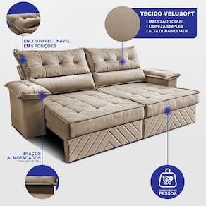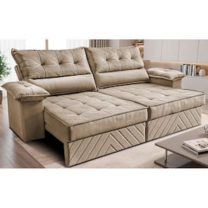 Sofá Retrátil e Reclinável 2,10m com Molas e Espuma D33 Thunder. Velusoft Cama inBox - Bege